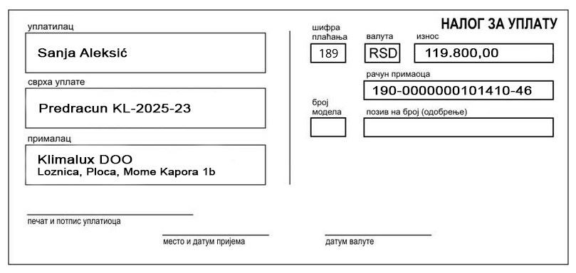 - Cena: tarifa kurirske službe (Zavisi od težine: 1500-2500 RSD za 1 kućni klima uređaj)